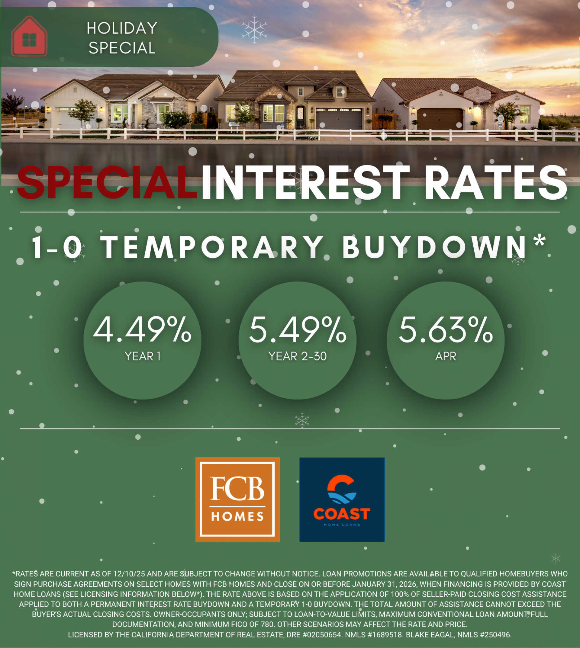 *RATES ARE CURRENT AS OF 12/10/25 AND ARE SUBJECT TO CHANGE WITHOUT NOTICE. LOAN PROMOTIONS ARE AVAILABLE TO QUALIFIED HOMEBUYERS WHO SIGN PURCHASE AGREEMENTS ON SELECT HOMES WITH FCB HOMES AND CLOSE ON OR BEFORE JANUARY 31, 2026, WHEN FINANCING IS PROVIDED BY COAST HOME LOANS (SEE LICENSING INFORMATION BELOW*). THE RATE ABOVE IS BASED ON THE APPLICATION OF 100% OF SELLER-PAID CLOSING COST ASSISTANCE APPLIED TO BOTH A PERMANENT INTEREST RATE BUYDOWN AND A TEMPORARY 1-0 BUYDOWN. THE TOTAL AMOUNT OF ASSISTANCE CANNOT EXCEED THE BUYER’S ACTUAL CLOSING COSTS. OWNER-OCCUPANTS ONLY; SUBJECT TO LOAN-TO-VALUE LIMITS, MAXIMUM CONVENTIONAL LOAN AMOUNT, FULL DOCUMENTATION, AND MINIMUM FICO OF 780. OTHER SCENARIOS MAY AFFECT THE RATE AND PRICE.