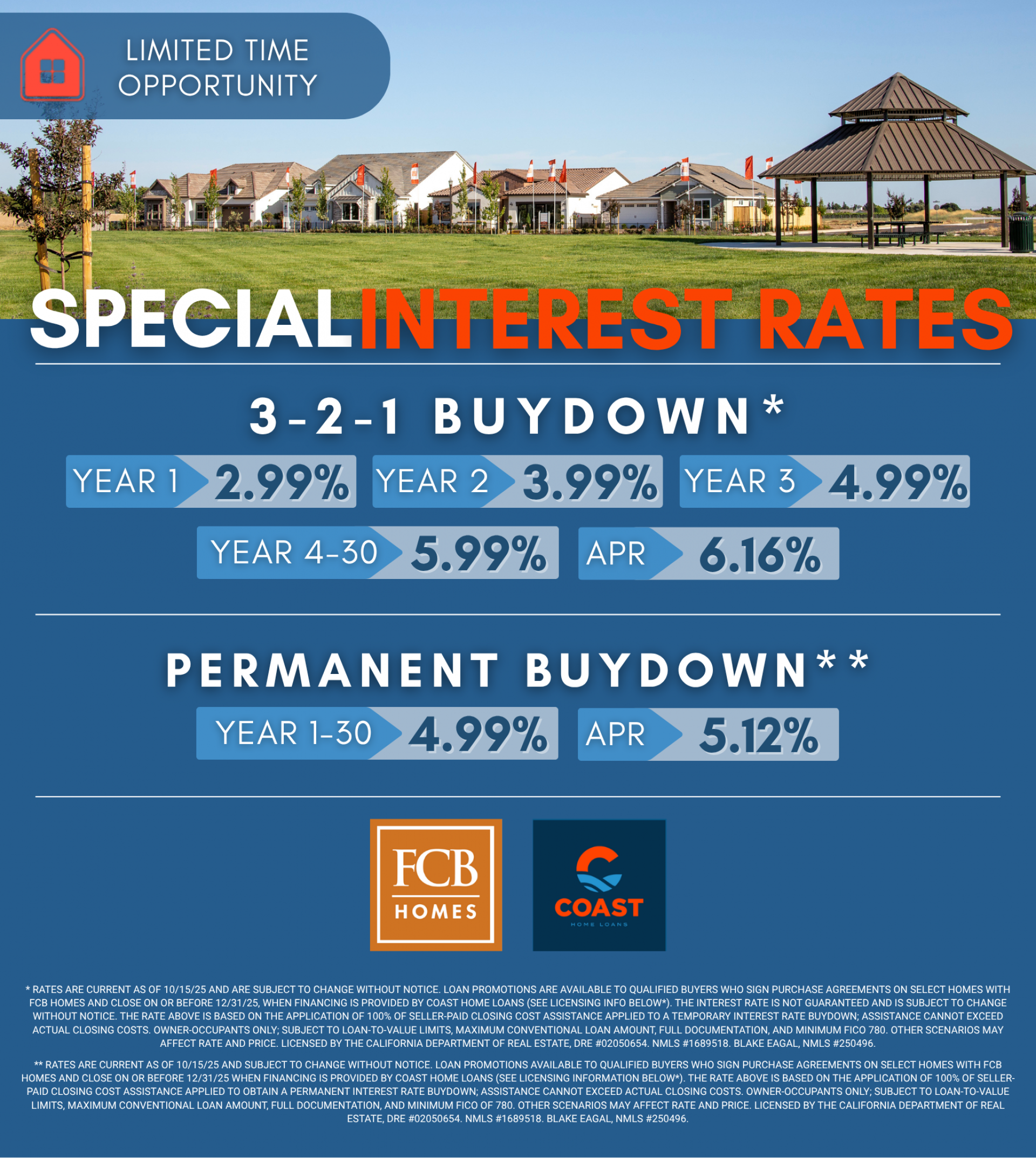* RATES ARE CURRENT AS OF 10/15/25 AND ARE SUBJECT TO CHANGE WITHOUT NOTICE. LOAN PROMOTIONS ARE AVAILABLE TO QUALIFIED BUYERS WHO SIGN PURCHASE AGREEMENTS ON SELECT HOMES WITH FCB HOMES AND CLOSE ON OR BEFORE 12/31/25, WHEN FINANCING IS PROVIDED BY COAST HOME LOANS (SEE LICENSING INFO BELOW*). THE INTEREST RATE IS NOT GUARANTEED AND IS SUBJECT TO CHANGE WITHOUT NOTICE. THE RATE ABOVE IS BASED ON THE APPLICATION OF 100% OF SELLER-PAID CLOSING COST ASSISTANCE APPLIED TO A TEMPORARY INTEREST RATE BUYDOWN; ASSISTANCE CANNOT EXCEED ACTUAL CLOSING COSTS. OWNER-OCCUPANTS ONLY; SUBJECT TO LOAN-TO-VALUE LIMITS, MAXIMUM CONVENTIONAL LOAN AMOUNT, FULL DOCUMENTATION, AND MINIMUM FICO 780. OTHER SCENARIOS MAY AFFECT RATE AND PRICE. LICENSED BY THE CALIFORNIA DEPARTMENT OF REAL ESTATE, DRE #02050654. NMLS #1689518. BLAKE EAGAL, NMLS #250496.